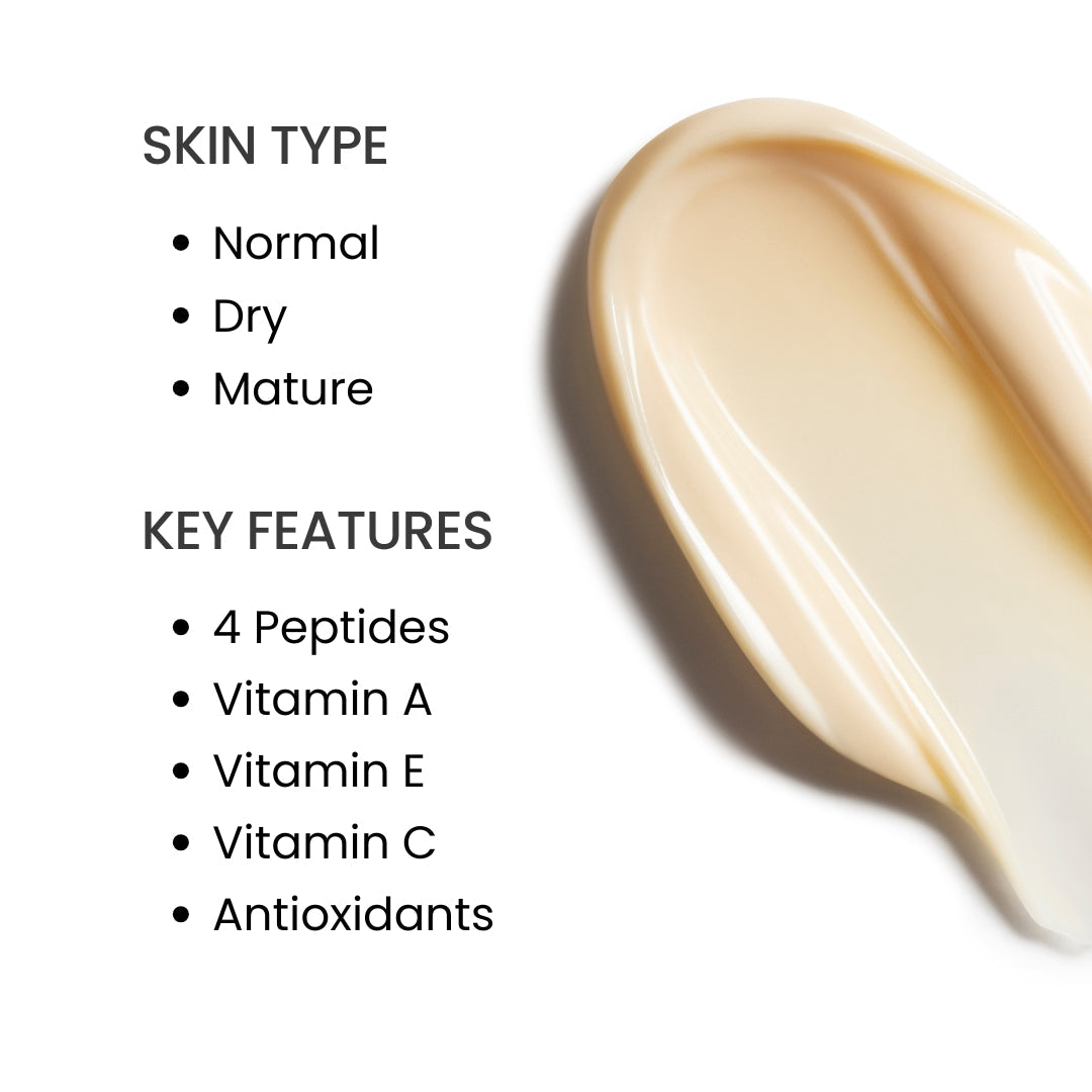 Peptides: Palmitoyl Tetrapeptide-7, Palmitoyl Pentapeptide-4, Palmitoyl Tripeptide-1, Palmitoyl Hexapeptide-12 Featuring a potent concentration of peptides, that stimulate collagen production, improve elasticity, and reduce the appearance of fine lines and wrinkles.
