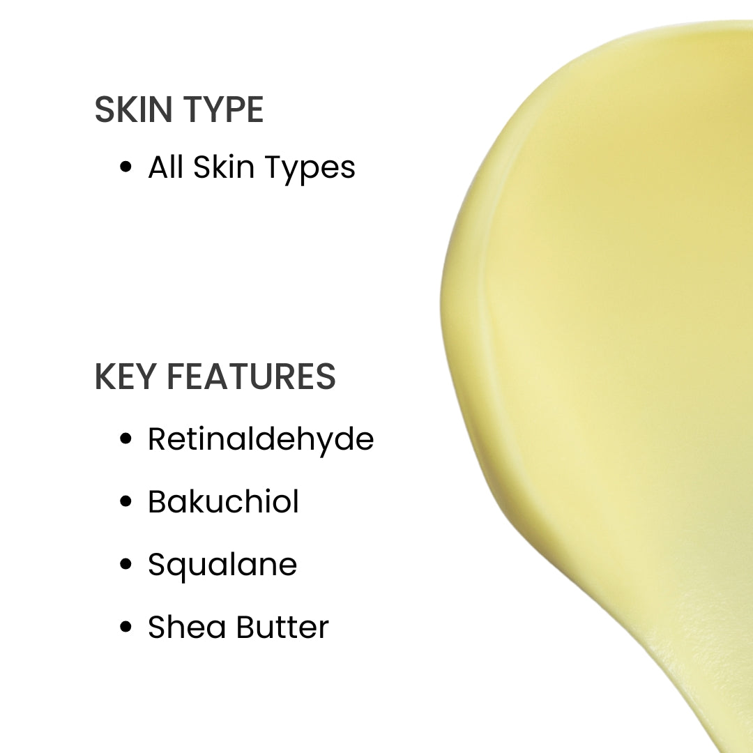 Water (Aqua), Glycerin, Squalane, C12-15 Alkyl Benzoate, Caprylic/ Capric Triglyceride, Aloe Barbadensis Leaf Juice, Cetearyl Olivate, Sorbitan Olivate, Butyrospermum Parkii (Shea) Butter, Cetearyl Alcohol, Dimethicone, Sodium Hyaluronate, Cetyl Palmitate, Sorbitan Palmitate, Bakuchiol, Retinaldehyde, Triethanolamine, Caprylyl Glycol, Ethylhexylglycerin, Hexylene Glycol, Phenoxyethanol, Carbomer, BenzoicAcid, Hydroxyethyl Acrylate/Sodium Acryloyldimethyl Taurate Copolymer, Sorbitan Isostearate, Disodium EDTA